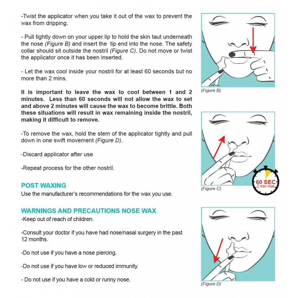 - IT IS IMPORTANT TO LEAVE THE WAX TO COOL BETWEEN 1 AND 2 MINUTES. LESS THAN 60 SECONDS WILL NOT ALLOW THE WAX TO SET AND MORE THAN 2 MINUTES WILL CAUSE THE WAX TO BECOME BRITTLE. BOTH THESE SITUATIONS WILL RESULT IN WAX REMAINING INSIDE THE NOSTRIL, MAKING IT DIFFICULT TO REMOVE.
