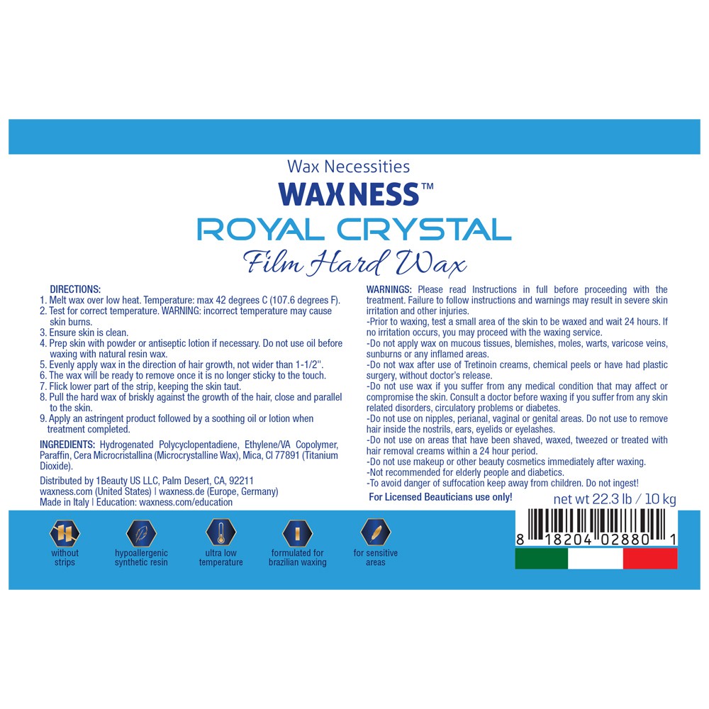 Description: Waxness Royal Crystal is a Premium Luxury Depilatory Hard Wax made from the highest quality hypoallergenic resin with our unique blend of ingredients that work to create a flexible, yet strong wax.