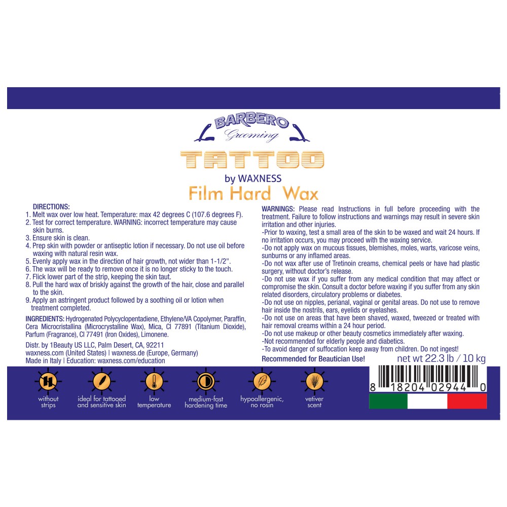 Waxness Barbero Tattoo is a low temperature, hypoallergenic, creamy wax specially formulated to protect sensitive tattooed skin.