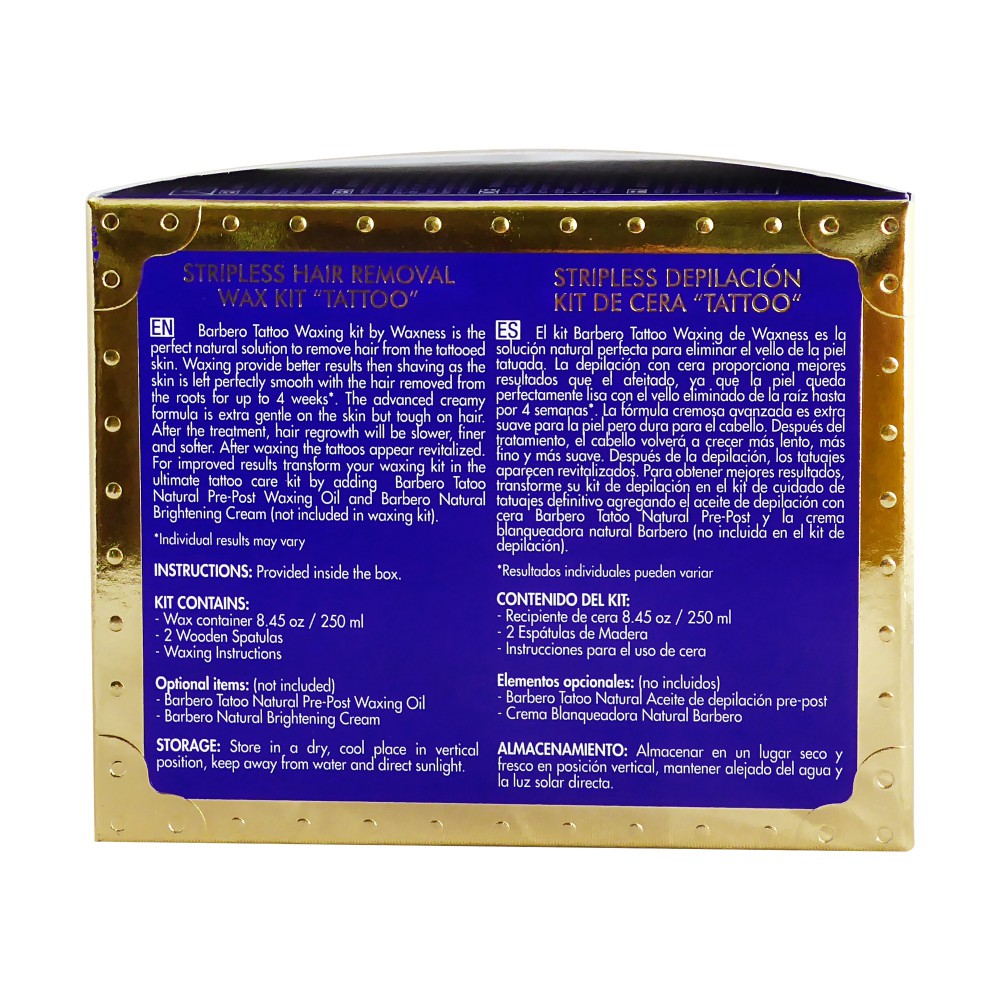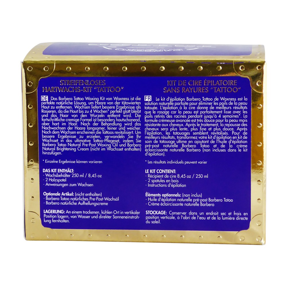 Barbero Tattoo Waxing kit by Waxness is the perfect natural solution to remove hair from the tattooed skin. Waxing provides better results then shaving as the skin is left perfectly smooth with the hair removed from the roots for up to 4 weeks*. The advanced creamy formula is extra gentle on the skin but tough on hair. After the treatment, hair regrowth will be slower, finer, and softer. After waxing the tattoos appear revitalized. For improved results transform your waxing kit into the ultimate tattoo care kit by adding Barbero Tatoo Natural Pre-Post Waxing Oil and Barbero Natural Brightening Cream (not included in waxing kit).