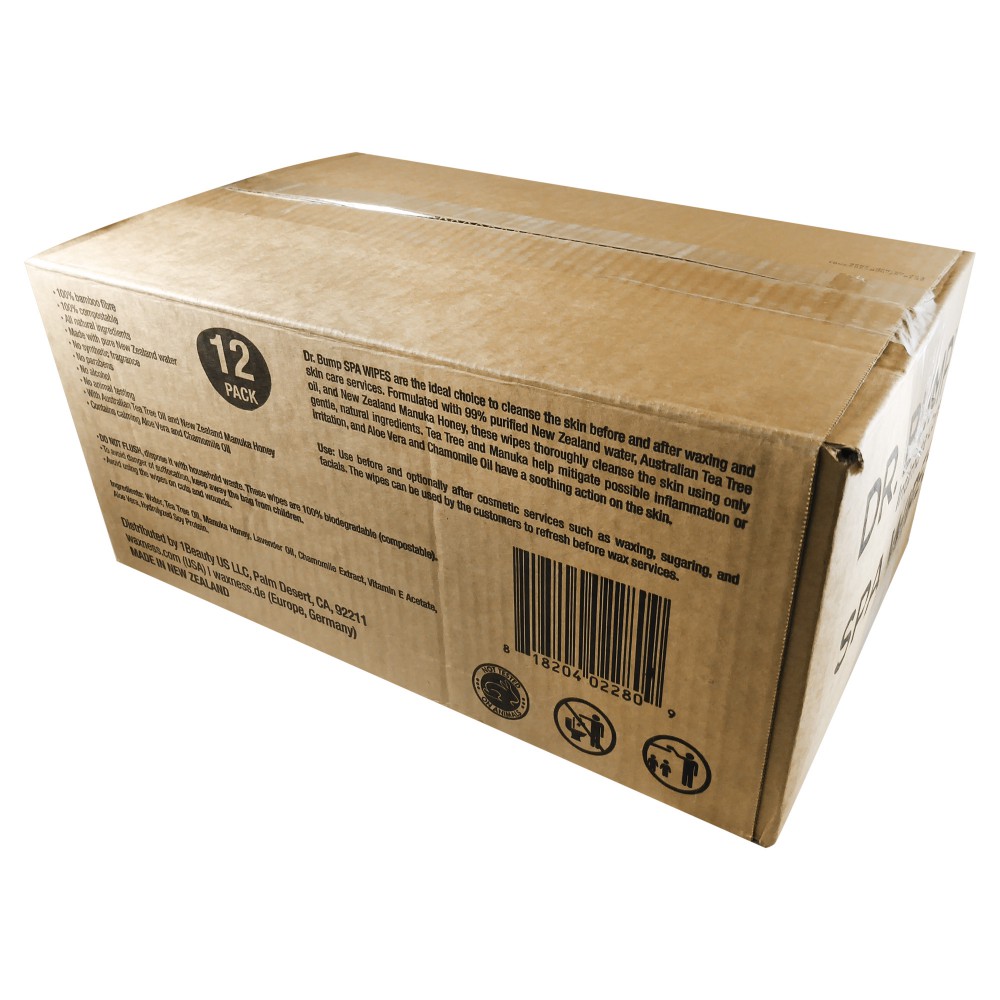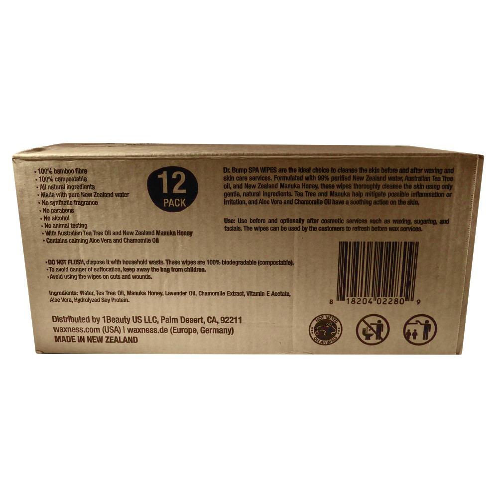 Dr. Bump SPA WIPES are the ideal choice to cleanse the skin before and after waxing and skin care services. Formulated with 99% purified New Zealand water, Australian Tea Tree oil, and New Zealand Manuka Honey, these wipes thoroughly cleanse the skin using only gentle, natural ingredients. Tea Tree and Manuka help mitigate possible inflammation or irritation, and Aloe Vera and Chamomile Oil have a soothing action on the skin.