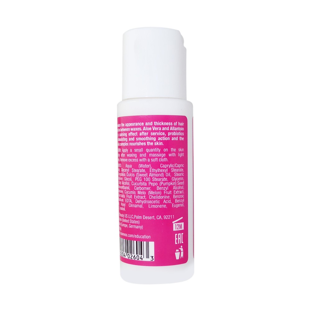 Directions: Apply a small quantity on the skin immediately after waxing and massage with light movements. Remove excess with a soft cloth.