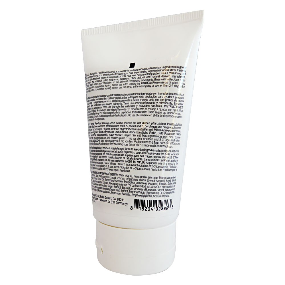 Description: Scrubing is a key action that prevent ingrown hair and bumps after waxing. The Dr Bump Pre-Post Waxing Scrub is specially formulated with natural botanical  ingredients to gently exfoliate and soothe the skin before and after waxing to help in preventing ingrown hair and bumps. It gently exfoliate the skin dead cell with micro apricot kernels and aloe vera has a soothing action. Has a refreshing and cooling action. No artificial color, fragrance, parabens. 99% natural and natural derived ingredients.
