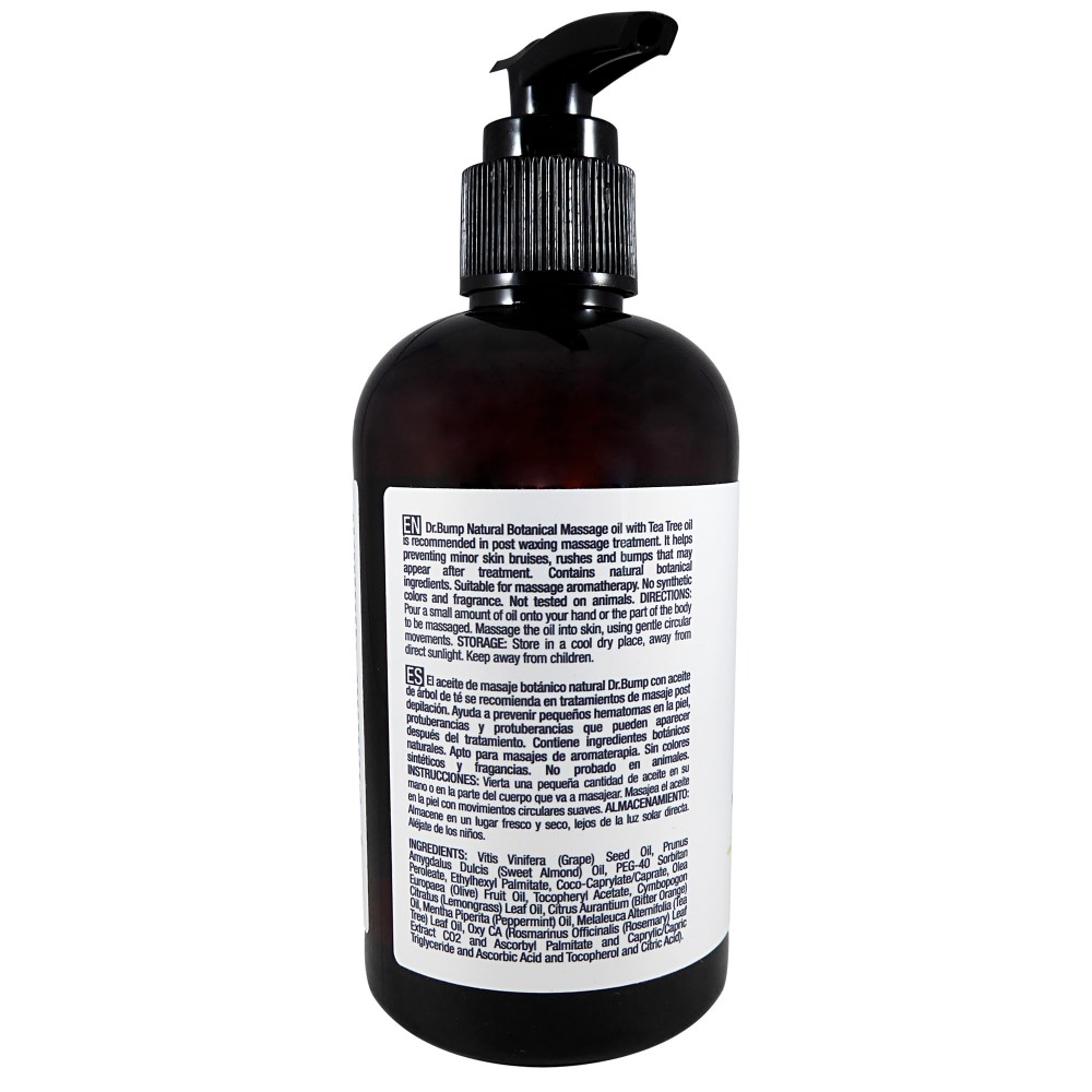 Dr.Bump Natural Botanical Massage oil with Tea Tree oil is recommended in post waxing massage treatment. It helps preventing minor skin bruises, rushes and bumps that may appear after treatment. Contains natural botanical ingredients. Suitable for massage aromatherapy.No synthetic colors and fragrance. Not tested on animals.