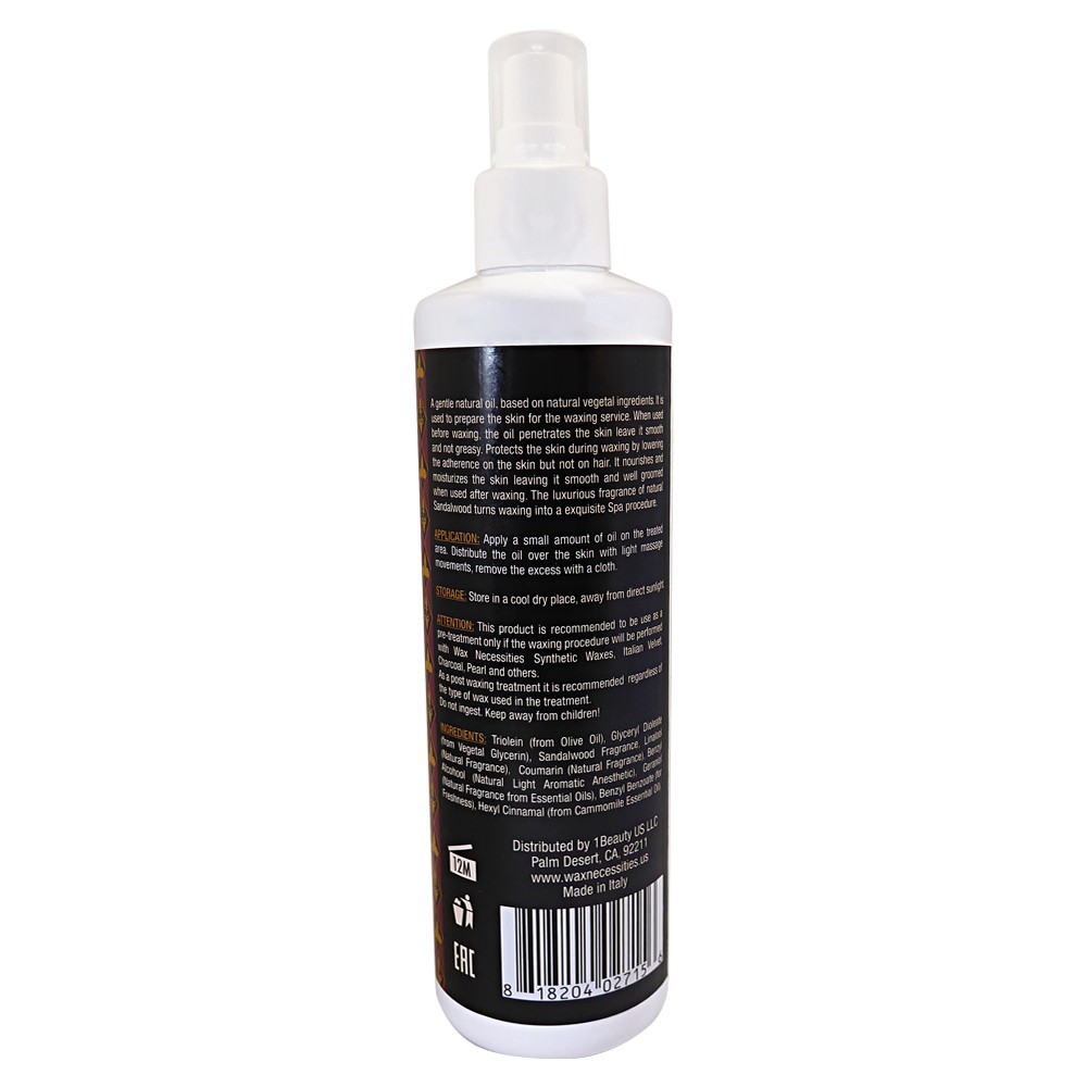 Attention: The product is recommended to be use as a pre-treatment only if the waxing procedure will be performed with Wax Necessities Synthetic Waxes, Italian Velvet, Charcoal, Pearl and others. As a post waxing treatment it is recommended regardless of the type of wax used in the treatment. Do not ingest. Keep away from children!