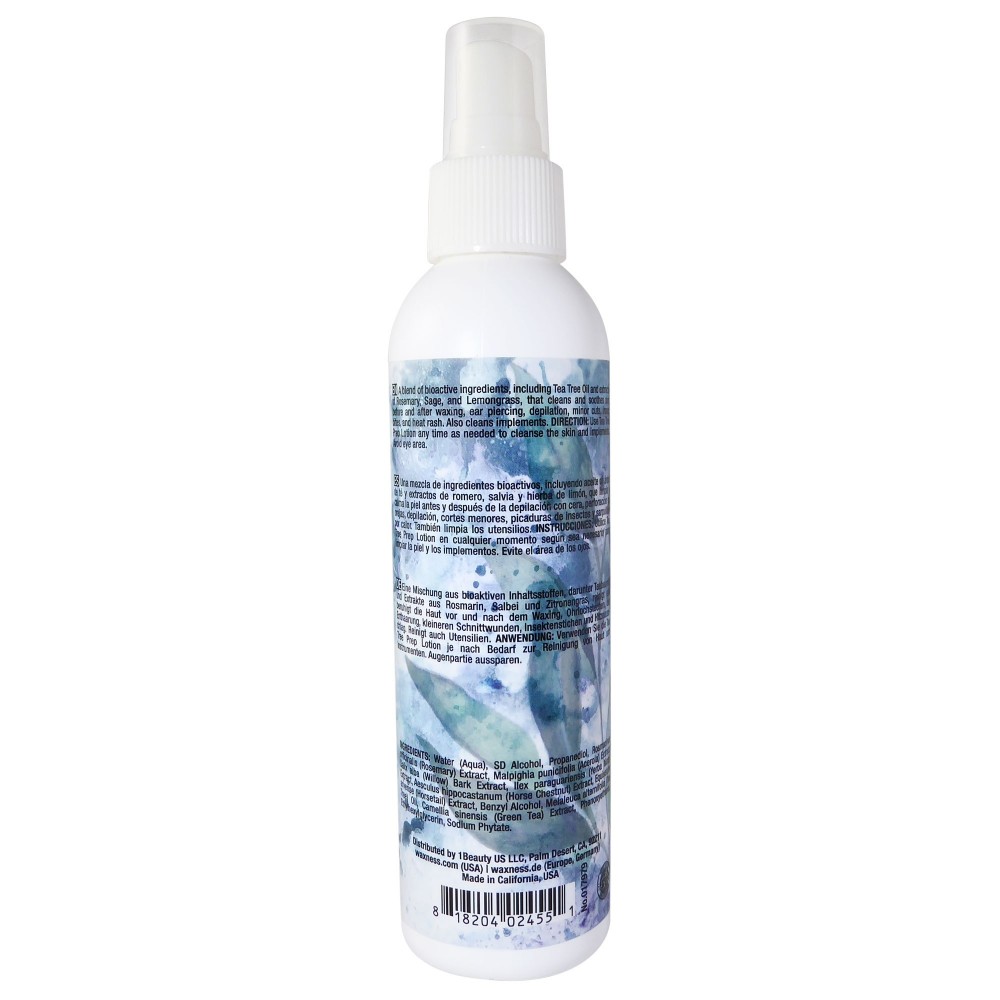 A blend of bioactive ingredients, including Tea Tree Oil and extracts of Rosemary, Sage, and Lemongrass, that cleans and soothes skin before and after waxing, ear piercing, depilation, minor cuts, insect bites, and heat rash. Also cleans implements.