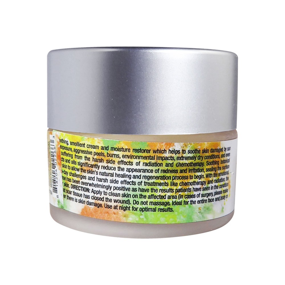A soothing, emollient cream and moisture restorer which helps to soothe skin damaged by sun overexposure, aggressive peels, burns, environmental impacts, extremely dry conditions, and even skin suffering from the harsh side effects of radiation and chemotherapy. Soothing botanical extracts and oils significantly reduce the appearance of redness and irritation, sealing the surface of the skin to allow the skin's natural healing and regeneration process to begin. With the emotional, day-to-day challenges and harsh side effects of treatments like chemotherapy and radiation, the response has been overwhelmingly positive as have the results patients have seen in the condition of their skin.