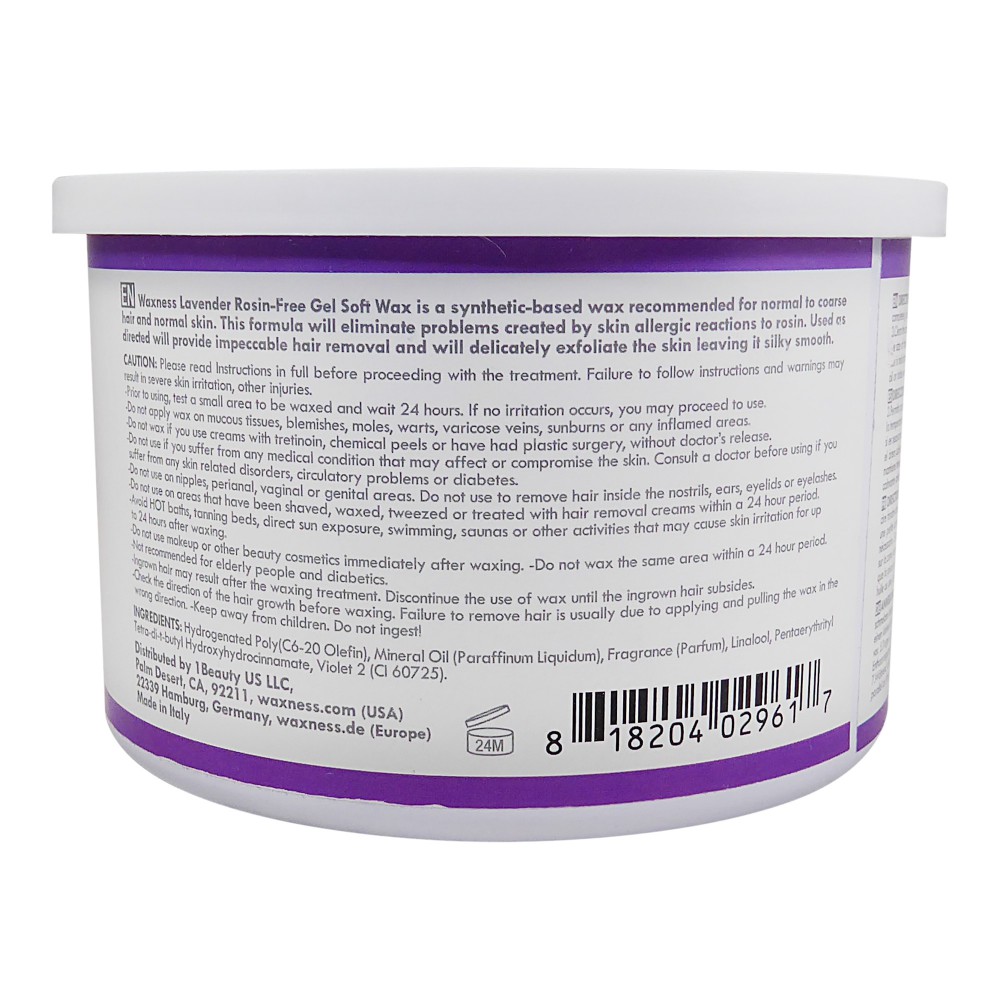 Waxness Lavender Rosin-Free Gel Soft Wax is a synthetic-based wax recommended for normal to coarse hair and normal skin. This formula will eliminate problems created by skin allergic reactions to rosin. Used as directed will provide impeccable hair removal and will delicately exfoliate the skin leaving it silky smooth.